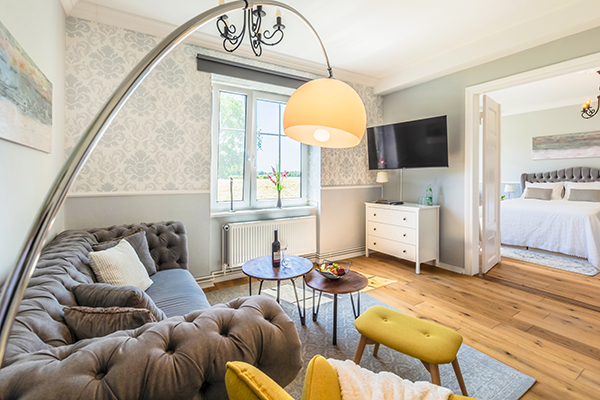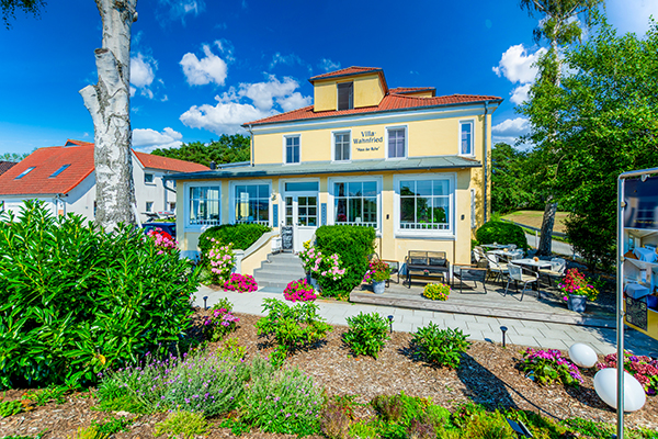 Die Villa Wahnfried ist in Thiessow. Ein kleines, feines Hotel mit 10 Doppelzimmern liegt auf einer Landzunge umgeben von Wasser, Weite und der Stille der Natur. Ein Ort zum Ankommen und durchatmen. Hier auf der Halbinsel Mönchsgut zeigt sich Rügen von seiner stillen, ursprünglichen Seite – mit weiten Feldern, sanften Hügeln und dem Klang der Vogelstimmen. Ob mit Wanderschuhen, auf zwei Rädern oder Barfuß im Sand. Hier darf der Alltag leise werden und die Zeit beginnt langsamer zu fließen.